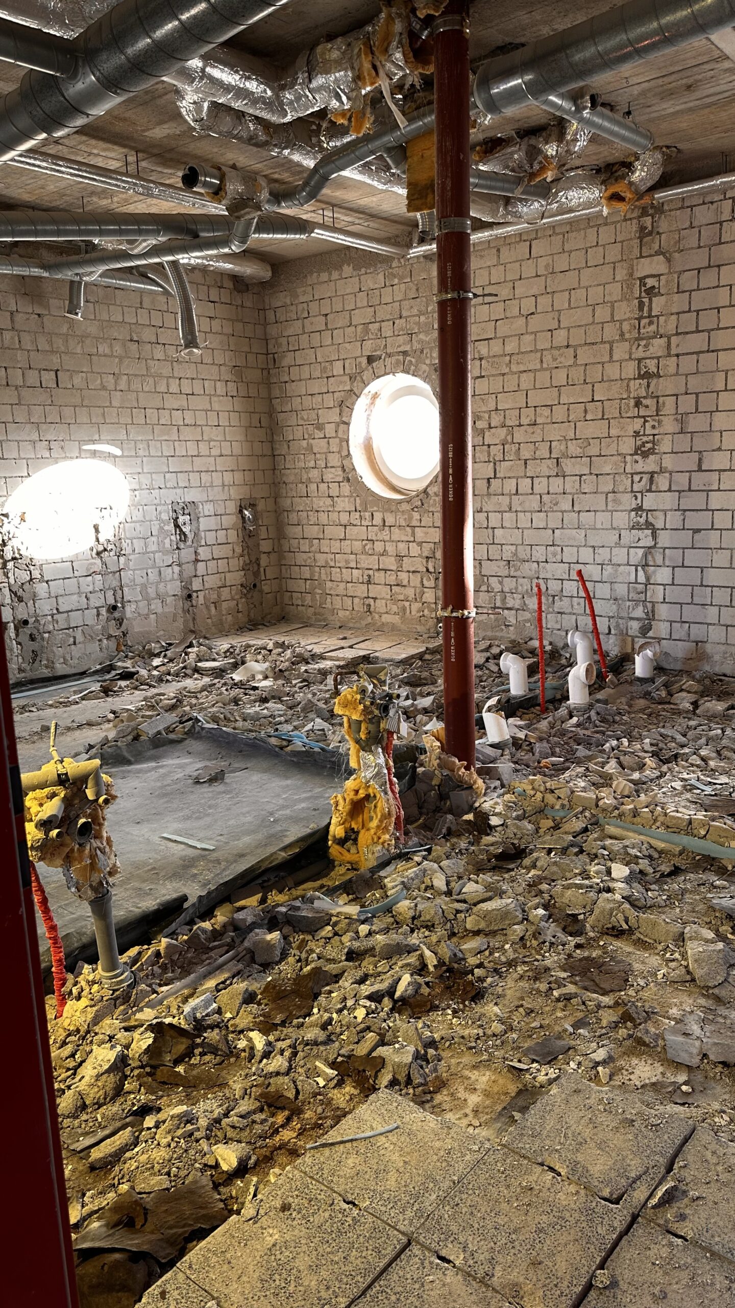 Seit dem Beginn der Ferien kann man am RBB V-R, Standort Lübecker Allee 4, einen ersten Eindruck davon bekommen, wie die Atmosphäre während der Bauarbeiten zum Berufsschulcampus sein könnte, denn am Standort in der Lübecker Allee findet während der unterrichtsfreien Zeit die Strangsanierung aller Zu- und Abwasserleitungen statt. Diese vorgezogene Maßnahme wird notwendig, weil die vorhandenen Leitungen völlig marode und nur noch sehr unzuverlässig funktionstüchtig sind. Zudem wird das Lernen und Lehren häufig durch unangenehme Gerüche beeinträchtigt.